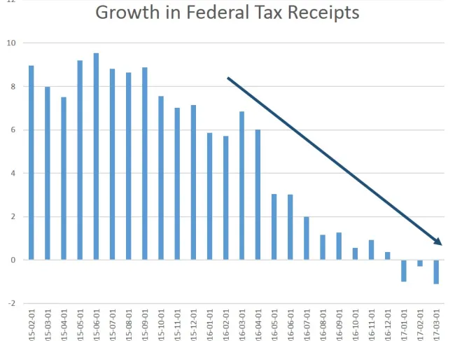 March 2017 was the fourth month in a row during which federal receipts were down year over year, while growth rates overall have been falling quickly since mid-2015.