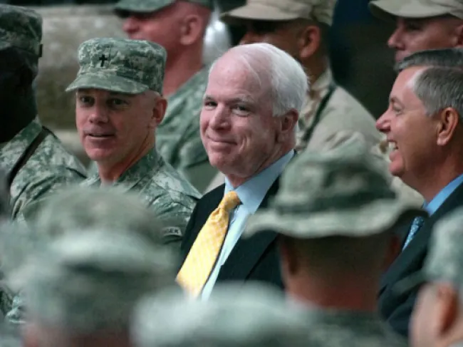 The senator from Arizona can run but can’t hide from the pollution he has left along his political path. Republicans wisely rejected war in Kosovo; McCain jettisoned party loyalty to call for bombs from above and “more boots on the ground.” At the prospects of war with Iran, McCain burst into song, “Bomb-bomb-bomb, bomb-bomb-Iran.” The possibility still makes this war ghoul smile. Before that, McCain promised a 100-year war in Iraq.