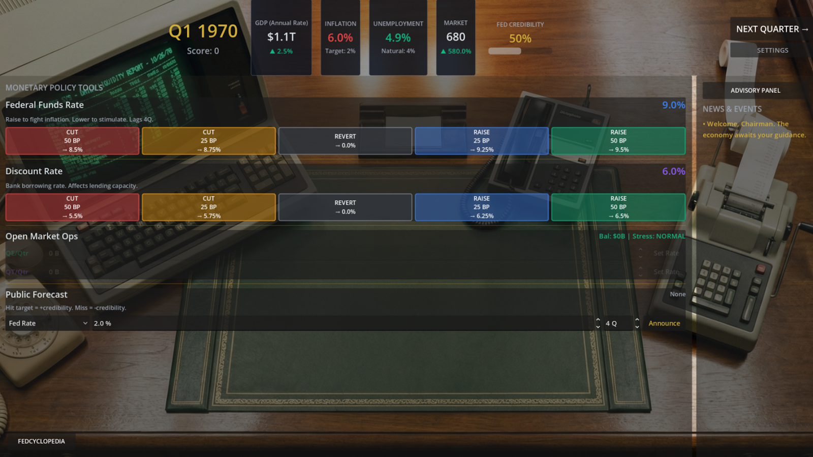 El juego es muy sencillo. Es por turnos y solo tienes que ajustar unas pocas palancas políticas. Se te proporcionan algunos datos sobre el PIB, la inflación, el desempleo, el mercado de valores, la «credibilidad de la Fed» y el nivel de tensión en el sistema bancario. También tienes un panel de noticias con titulares. Cada trimestre, debes tomar una decisión sobre el tipo de interés de los fondos federales, el tipo de descuento y las operaciones de mercado abierto. También puedes hacer anuncios sobre resultados futuros —los anuncios correctos ayudan a la credibilidad de la Fed, mientras que los incorrectos la dañan. Después de tomar tus decisiones, pasas al siguiente trimestre y empiezas de nuevo con datos nuevos.