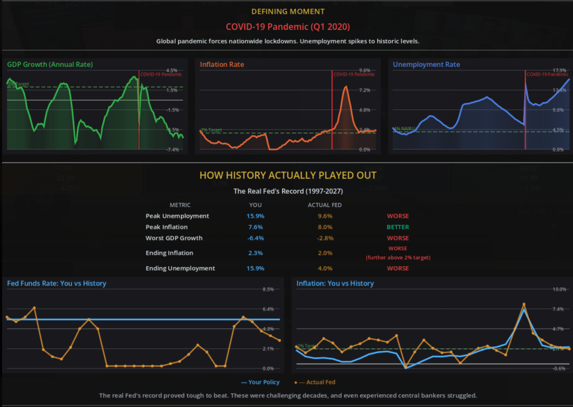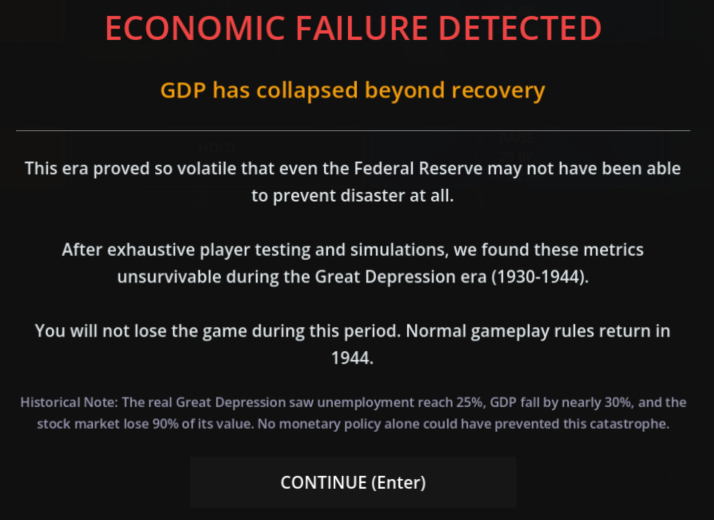 Una consecuencia desafortunada de esto es que el juego está diseñado de tal manera que ciertos acontecimientos económicos están destinados a ocurrir, independientemente de las decisiones que se tomen como presidente de la Fed en los años previos. Por ejemplo, independientemente de lo que haga el jugador, en 1929 se producirá una caída de la bolsa, seguida de un colapso del PIB y un aumento del desempleo. El juego lo reconoce: