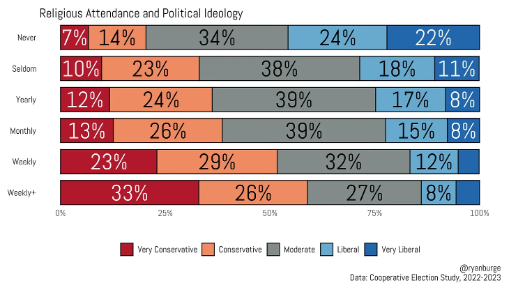 Entre los que asisten semanalmente o más de una vez por semana, no más del 16 % se identifica como «liberal» o «muy liberal». Casi el 60 % de los que asisten a servicios religiosos más de una vez por semana se identifican como conservadores o «muy conservadores». Esta correlación es tan sólida que incluso trasciende las categorías raciales.1