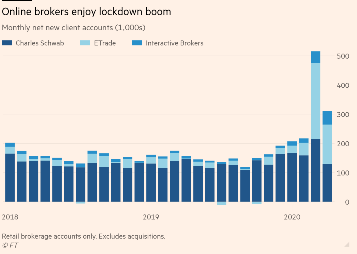 Han tenido que empezar a apostar por las acciones según el Financial Times. El FT informa que en marzo y abril, con Wall Street y 401(k)s siendo sacudidos por noticias económicas negativas, Charles Schwab, ETrade, e Interactive Brokers abrieron un número récord de cuentas, «agregando un colectivo de 780.000 nuevos clientes». Marzo, el punto culminante, ascendió a tres veces el promedio mensual de los últimos dos años».