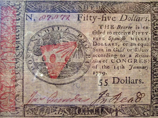When the war of the American Colonies against the British Crown broke out in 1775, the money supply of the Colonies consisted of about ten million dollars in gold and silver coins — “specie.” The taxation was difficult for the newly-formed Continental Congress and its credit was shaky. The new government turned eagerly to the printing press to finance its military expenditures, and issued two million dollars of paper to be redeemable, dollar for dollar, in specie. In need of money quickly at the start of the emergency, Congress intended to print only this initial amount. The idea was to collect taxes and redeem the credit money between 1779 and 1782.