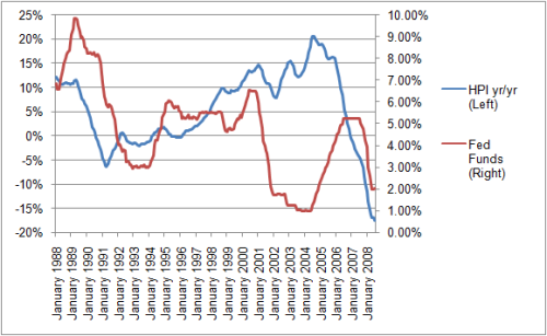 Even so, look at how much better the Austrian theory makes sense of the observations. The following chart shows year-over-year (i.e., twelve-month changes) in the famous Case-Schiller Home Price Index, plotted against the federal funds rate (the interest rate that the Fed targets):