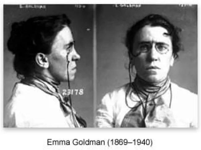 When World War I broke out, just as, nearly 90 years later, when the 9/11 attacks took place, many libertarians came down with war fever. Peter Kropotkin announced his support for the Allied cause in the conflict. So did Benjamin R. Tucker. But Emma Goldman remained stalwart in her opposition to the war. She organized the No Conscription League to support those who refused the draft. She agitated indefatigably against the war and against US participation in it. She quickly ran afoul of the Wilson administration by doing these things and got herself thrown in the clink and then thrown out of the country.