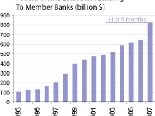 Compared to their limelight-hogging cousins — the Federal Reserve, Freddie Mac, and Fannie Mae — the FHL Banks don’t get much press. But from March to September, the amount of loans these banks have made to their 8,125 members has risen some $200 billion to stand at $822 billion, a whopping 32% jump in just six months.[1]