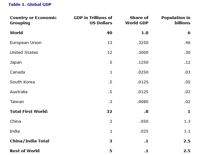 Such criticisms are not significant, however. The essential and vital point that the table makes clear is that countries representing a small minority of the world’s population account for the production of the overwhelming bulk of its goods and services. It shows this fact in the relatively simple, straightforward way of attributing .8 of the world’s output to countries containing just 1 billion of the world’s 6 billion people.3