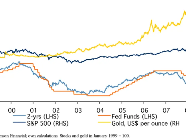 In this context, it is interesting to note that the US dollar price per gold ounce rose from US$268 in January 2001 — when the US Fed started cutting interest rates — to close to US$800 in December 2007. In other words, the exchange value of the US dollar fell around 67% vis-à-vis gold — the world’s ultimate means of payment. For comparison, the exchange value of the greenback declined 14% against US stocks (as expressed by the US S&P 500 index) in the same period.