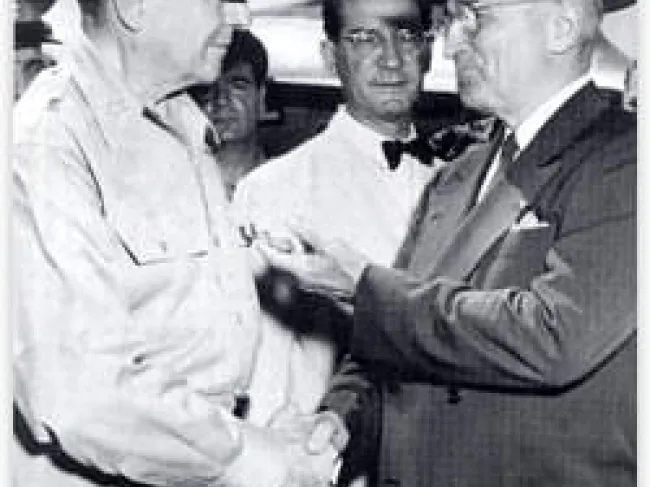 General MacArthur Receives Distinguished Service Medal from President TrumanIn the realm of direct politics, it seemed clear that there was only one place for those of us not totally disillusioned with political action: the “extreme right wing” of the Republican Party. It was the extreme Right, particularly well represented in the House, and including such men as Rep. Howard H. Buffett of Omaha (Senator Taft’s midwestern campaign manager in 1952), Rep. Ralph W. Gwinn of New York, Frederick C. Smith of Ohio, and H.R. Gross of Iowa (virtually the only one of the group now remaining), who were solidly isolationist and opposed to foreign wars and interventions, and roughly free-market and libertarian in domestic affairs.