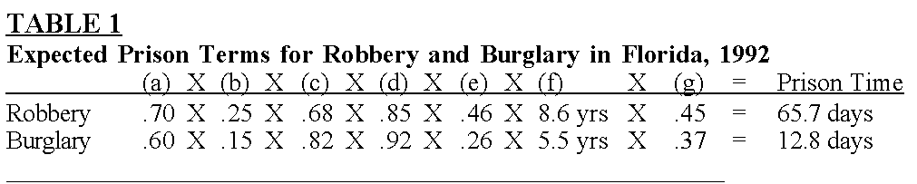 Consider the issue of deterrence, for example. Raising the “expected price of crime” for the potential criminal should reduce crime. Of course, this expected price is not the actual sentence given to convicted criminals, or even the portion of that sentence served (e.g., time in prison before parole or early release). Rather, it is determined by the probabilities that: (1) the crime is either reported to or observed by someone in a position to investigate and/or apprehend the wrongdoer (e.g., public police, private security, private citizens if they are allowed to do so); (2) the wrongdoer is apprehended; (3) the offender is charged and prosecuted after being apprehended (either through public or private justice procedures); (4) the prosecution is successful so an appropriate sentence is imposed (note in this regard that over 90 percent of convictions in the Untied States are achieved through plea and charge bargaining which lower the level of punishment relative to what the criminal would expect with a trial); (5) the sentence is actually carried out (e.g., criminals almost never pay restitution or serve the entire prison sentence that a judge hands down today). A rough approximation of this calculation can be made for some crimes using 1992 Florida data, assuming that the relevant punishment is imprisonment (e.g., that prohibition and various “intermediate sanctions” are not severe punishments, and that restitution is generally not collected). Table 1 summarizes these calculations for robbery and burglary.