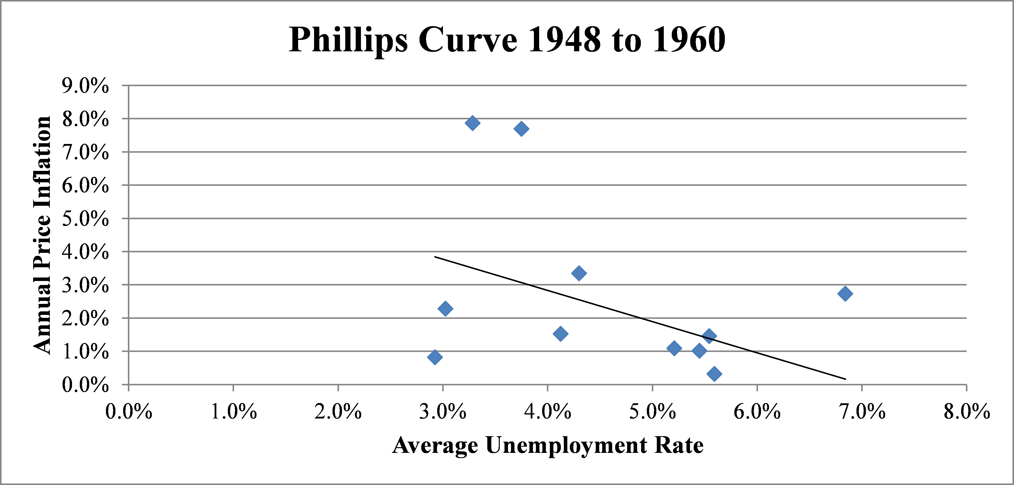 In 1958, New Zealand economist William Phillips wrote The Relation between Unemployment and the Rate of Change of Money Wage Rates in the United Kingdom, 1861–1957.2 The paper described an apparent inverse relationship between unemployment and increases in wage levels. The thesis was expanded in 1960 by Paul Samuelson in substituting wage levels with price levels. The level of price inflation and unemployment were thereafter linked as opposing forces: increasing one decreases the other, and vice versa. The US data from 1948 through 1960 comparing the year-over-year increases in the average price level with the average annual unemployment rate seemed irrefutable:3