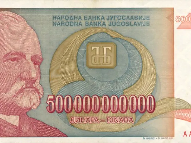 “In each of the past three climactic months of the hyperinflation, the dinar completely lost its value, with monthly devaluations of more than 99.99%. By December 1993, the end was in sight. The Topcider mint was working at full capacity, turning out 900,000 bank notes a month, but they were worthless before the ink had dried. On Dec. 23, 500-billion-dinar bills rolled off the press, worth 4.15 German marks when printed. But by the time they could be stuffed into pay packets, they were hardly worth spare change.