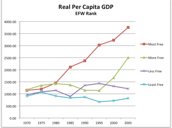 Still, the freest 25 percent showed steady growth and the most unfree 25 percent were poorer in absolute terms in 2005 (average of 2005–2009) than they were in 1970.