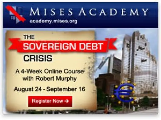 A major factor in the recent roller-coaster stock market is the sovereign-debt crisis. Investors the world over are growing more alarmed that the governments of the so-called PIIGS (Portugal, Ireland, Italy, Greece, and Spain) will default on their debts, which have assumed gigantic proportions because of reckless spending and ill-conceived bank bailouts. The situation has become so serious that many analysts think it’s only a matter of when the Eurozone will dissolve back into regional currencies. In order to provide a primer on these weighty headline issues, through the Mises Academy I am offering a short course on the sovereign-debt crisis, taught from an Austrian perspective, beginning next week.