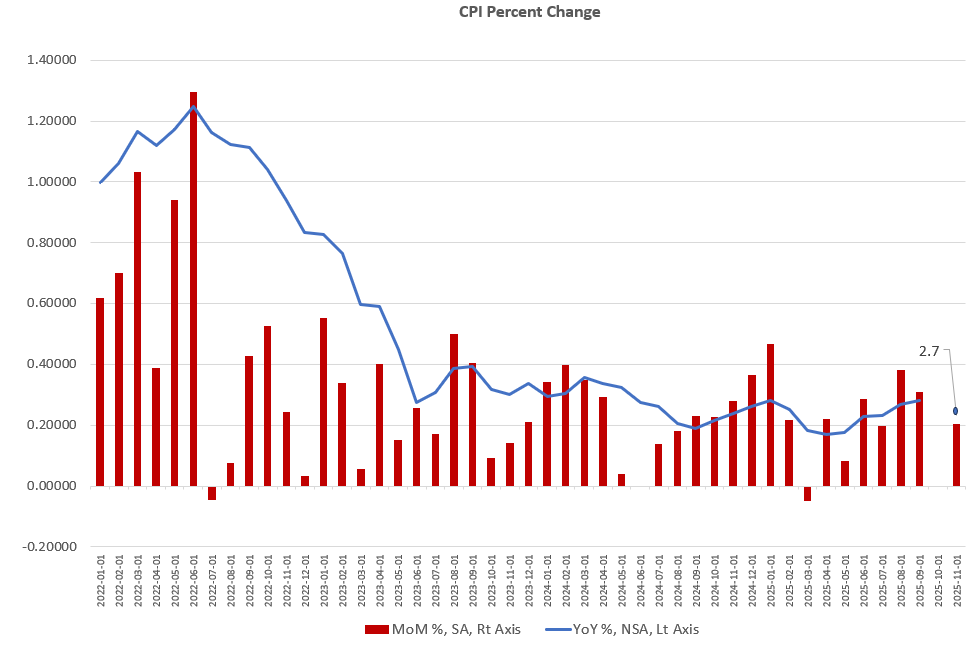 Measured year over year, CPI inflation in November was up by 2.7 percent, falling from September’s YoY increase of 3.0 percent. During the same period, the CPI rose by 0.20 percent from September to November. By comparison, the CPI rose by 0.31 percent from August to September.