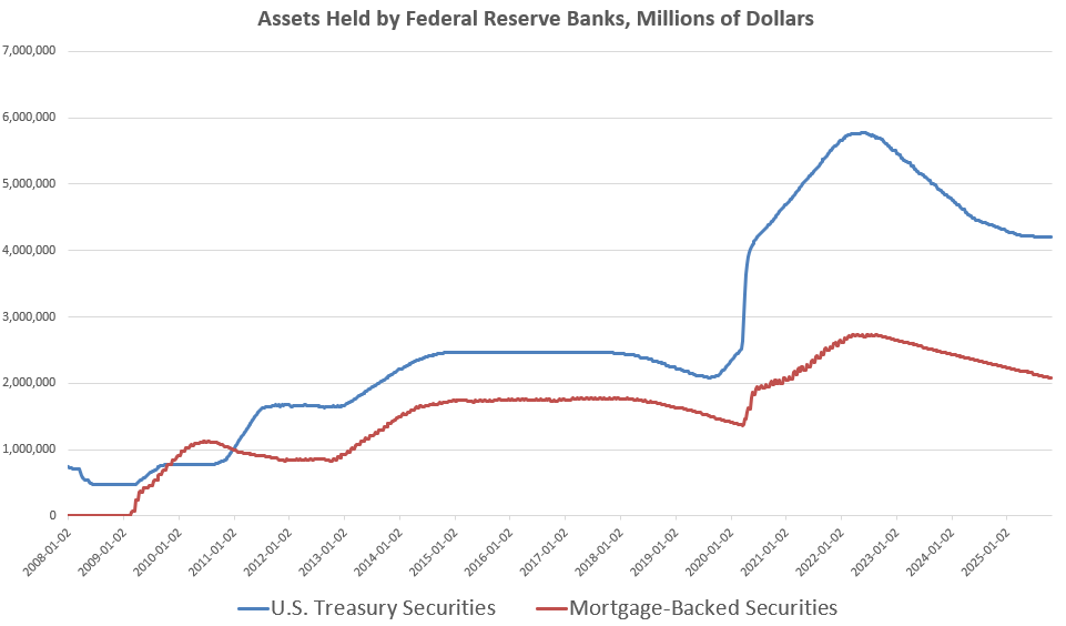 Notably, Powell also stated that the Fed will work to increase the proportion of Treasurys in the portfolio, in relation to mortgage securities (i.e., agency securities). This is an extension of the Fed’s existing policy—begun earlier this year—of reducing its stock of mortgage securities at a faster rate than it has been reducing its stock of Treasurys.