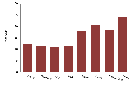 Private investment in Europe is not low because of insufficient domestic savings, but because of heavy government intervention that renders the business environment unattractive. Domestic savings are actually plentiful in several old member states such as Denmark, Germany, Ireland, the Netherlands and Sweden, but are mainly invested abroad. It results in very high current account surpluses (to the tune of 5 to 12% of GDP). As regards foreign investment, France, Germany and Italy have recorded a predominantly negative and volatile net foreign direct investment (FDI) balance, while US and China remain major destinations of FDI inflows in both absolute and relative terms.
