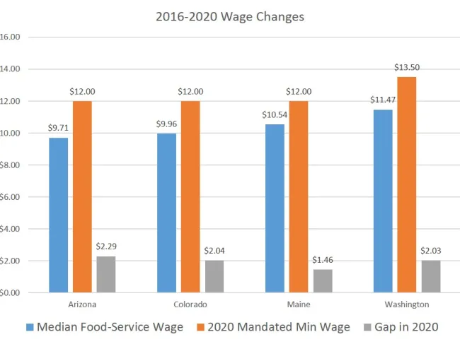 This graph shows current median food service wages with the new mandated wages to take effect in 2020: