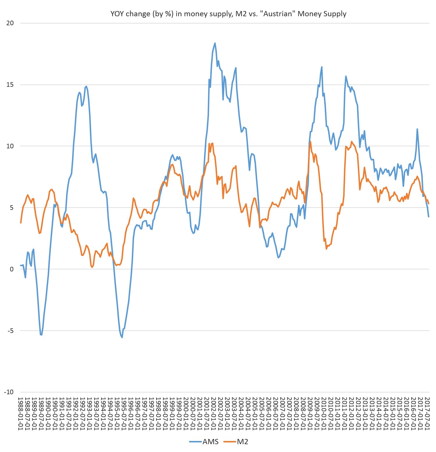 The money-supply metric used here — an “Austrian money supply” measure — is the metric developed by Murray Rothbard and Joseph Salerno, and is designed to provide a better measure than M2. The Mises Institute now offers regular updates on this metric and its growth.