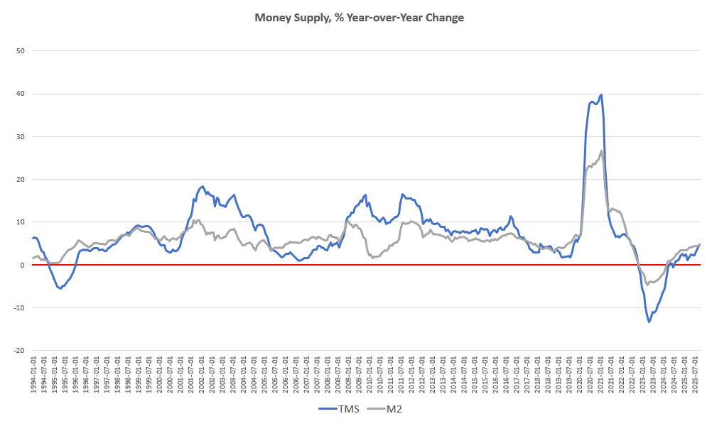 Historically, M2 growth rates have often followed a similar course to TMS growth rates, but M2 has even outpaced TMS growth in eleven of the last twelve months. In October, the M2 growth rate, year over year, was 4.63 percent. That’s up from September’s growth rate of 4.47 percent. October’s growth rate was also up from October 2024’s rate of 2.97 percent.