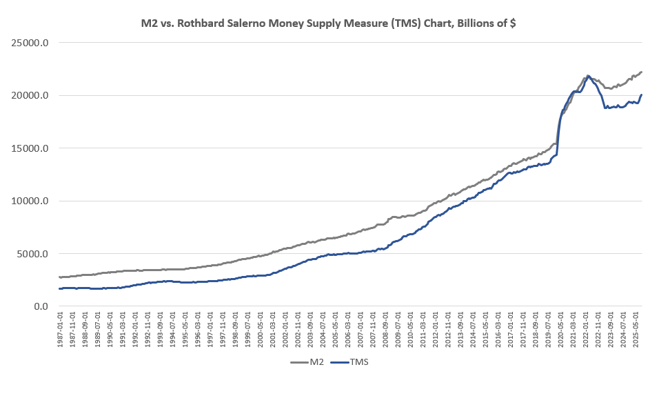 The money supply metric used here—the “true,” or Rothbard-Salerno, money supply measure (TMS)—is the metric developed by Murray Rothbard and Joseph Salerno, and is designed to provide a better measure of money supply fluctuations than M2. (The Mises Institute now offers regular updates on this metric and its growth.)