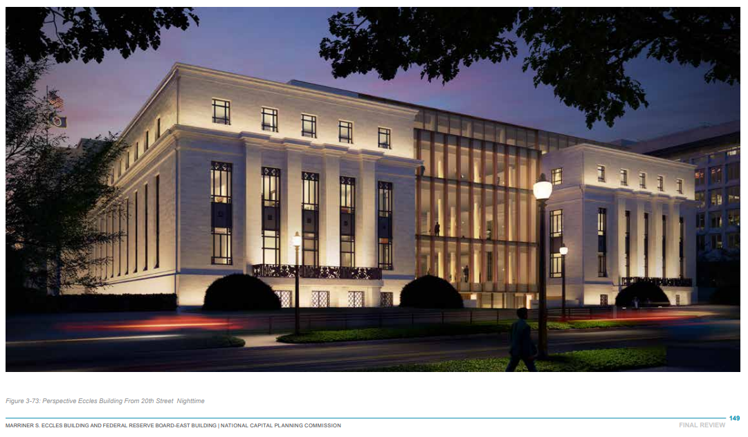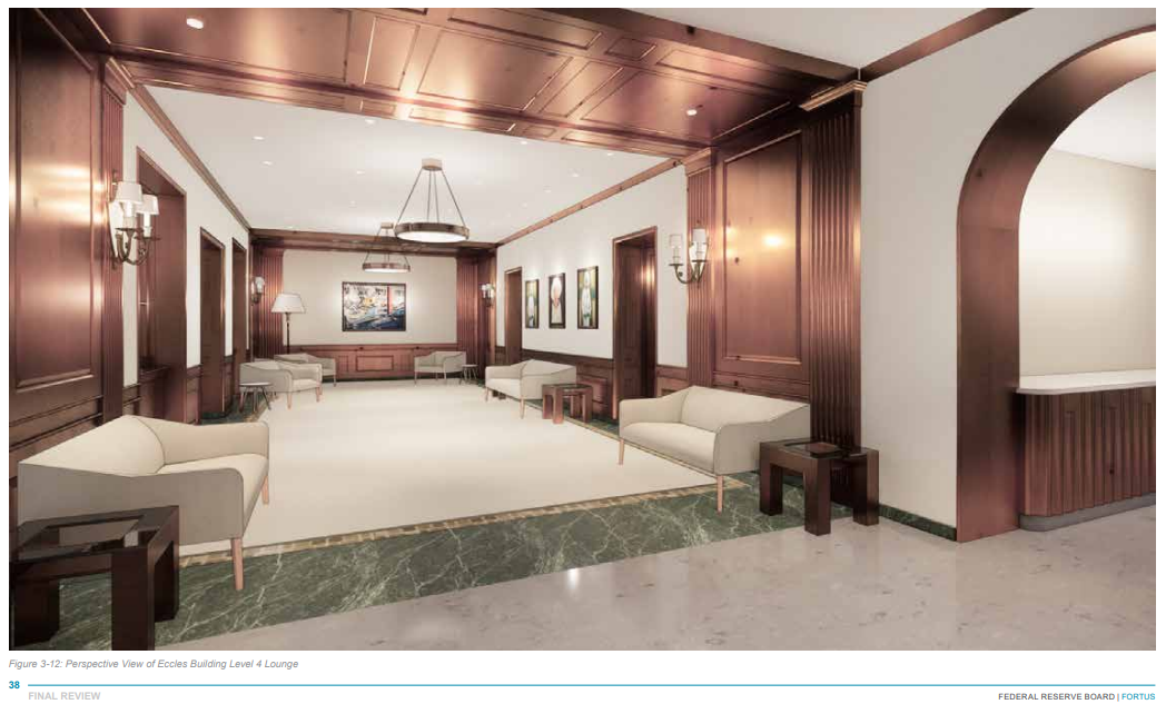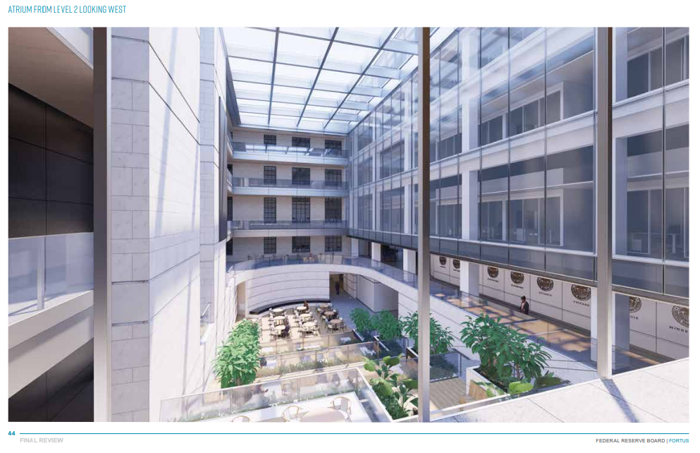 - An atrium VIP entrance, pictured below, with skylights in a “very calm, almost ethereal square grid with large format glass,” with “twelve equal spaces in salute of the Federal Reserve’s branch banks. Each branch bank will be recognized with their name engraved in glass panels” (p. 34).