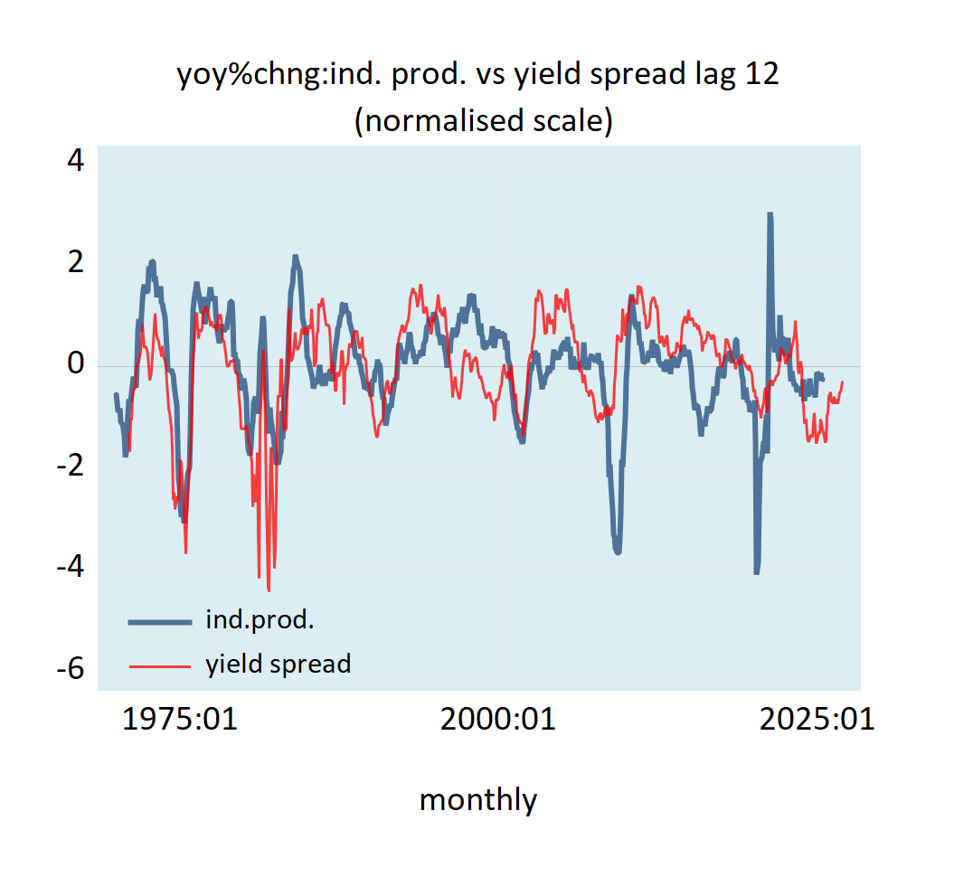 Most economic commentators consider the differential, also known as the yield curve, between the long-term and the short-term interest rates as an important indicator for the establishment of the future course of economic activity. An increase in the yield curve is seen as pointing towards good economic times ahead. Conversely, a declining yield curve increases the likelihood of an economic recession. In the US, historically, the differential between the yield on the 10-year T-Bond and the federal funds rate was leading the yearly growth rate of industrial production by 12-months (see chart).