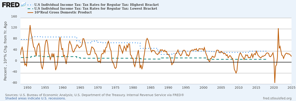 Figure 2—Federal income tax rates (percent) and annual real GDP growth rate (percent x10)