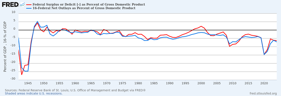 Figure 3—Federal Deficits (percent) and 16 percent less Net Federal Outlays as percent of GDP