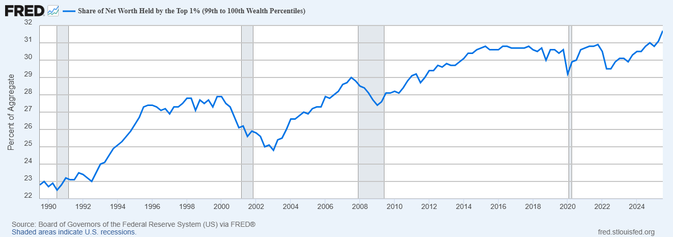 The graph shows the “net worth” estimate of wealth of the top 1 percent over time. The top possessed almost 23 percent of all counted wealth in 1990 and that increased to almost 32 percent of wealth in 2025.