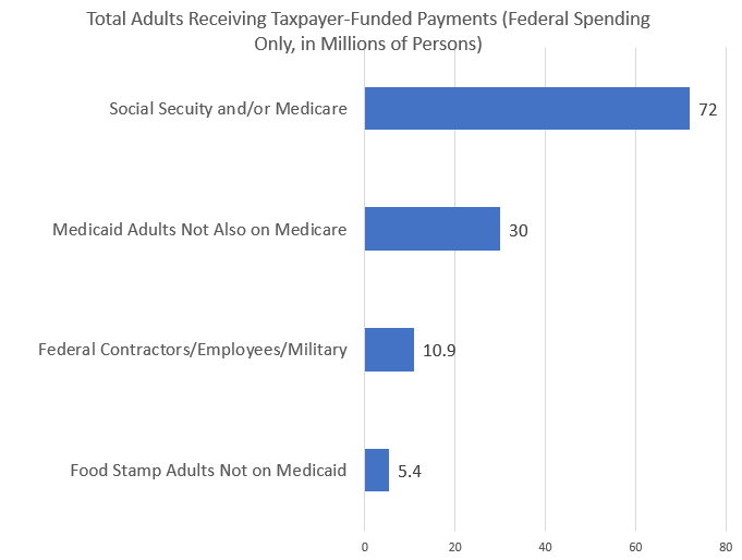 Sure, many contractors and federal employees will tell you that they aren’t in the same category as welfare recipients because they “work.” But from the point of view of tax transfers and fiscal policy, there is no difference at all. The issue here isn’t morality or virtue or whether or not someone “deserves” his tax-funded check. We’re simply pointing out the millions of Americans whose income is based on a forcible transfer of wealth from the taxpayers to the recipients’ pocket.
