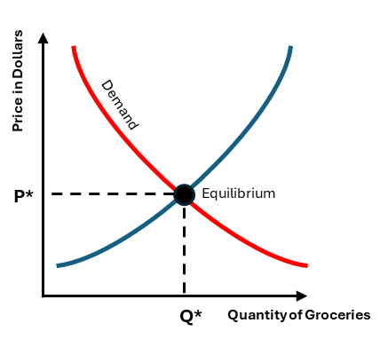 We can illustrate this with an example, using groceries on the horizontal axis and price in dollars on the vertical axis. For simplification, “groceries” represent a general basket of food items rather than any single product.