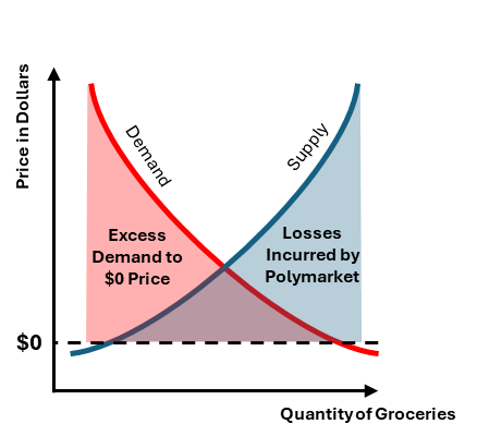 - The price of groceries is artificially set to $0. Since the cost of producing groceries exceeds $0, no rational supplier would provide goods at this price, as doing so would guarantee a loss. In this case, the store was supported through Polymarket, meaning those losses were absorbed by them. This leads to the second effect.