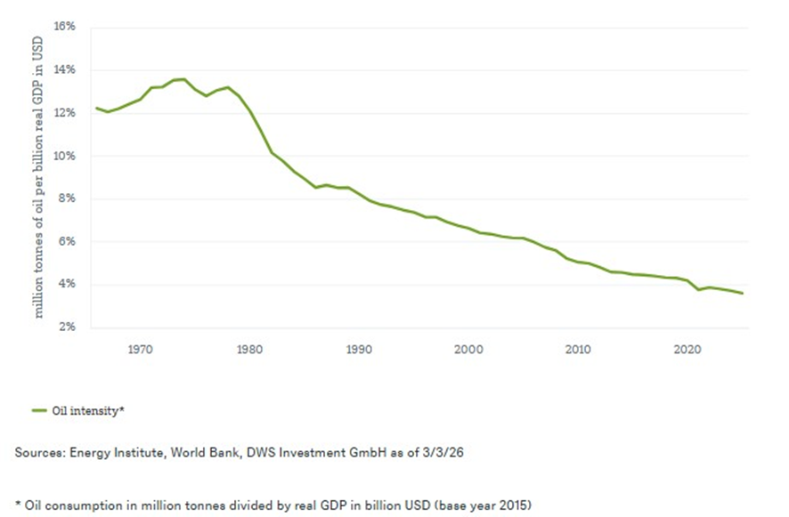 For example, let us examine the issues today stemming from the war in Iran and the Strait of Hormuz. As the following graph shows, oil consumption per unit of GDP has been falling since the late 1970s, thanks to the technology used to utilize and extract crude oil much more efficiently. For example, fracking has made the US a net exporter of energy since 2019.
