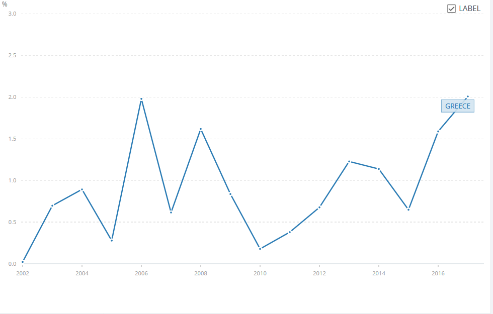 Finally, political instability undermine investment and growth. The World Bank provides data from which an index has been created that depicts political stability. 2.5 points of the index indicates strength political stability and -2.5 points indicates political instability. The picture below proves the political instability of Greece.