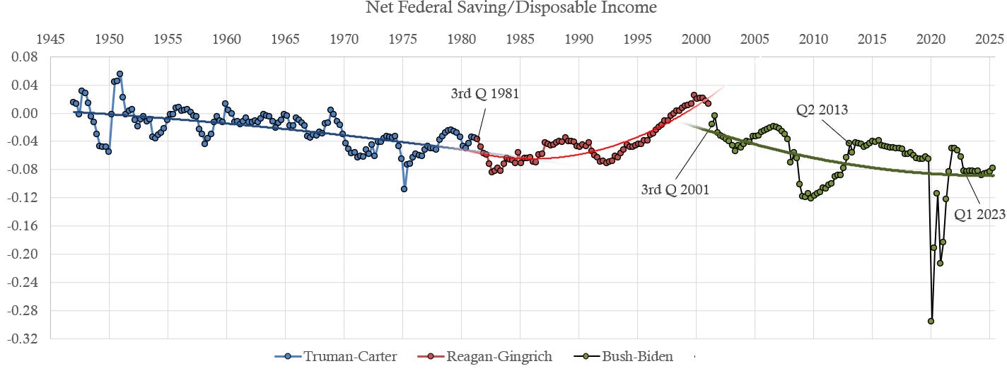 The next graph depicts net federal saving relative to total disposable income- negative numbers indicating borrowing. The financial position of the United States between World War Two and 1981 deteriorated. During the 1950s, President Eisenhower ran a few small surpluses, and no large deficits. Eisenhower was a true fiscal Conservative, who had deficit increases only during the recessions of 1954 and 1958, unavoidably. President Kennedy also avoided large additions to the national debt. Kennedy was under the sway of responsible Demand side Economists, who pushed for small deficits to stimulate the economy only during recessions. Consequently, the relative burden of WW2 debt fell as a percentage of gross domestic product during the Truman-Kennedy years.