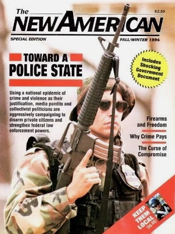 Some conservatives saw what was coming. In its fall/winter 1994 issue of The New American magazine, the John Birch Society devoted multiple articles to the theme of how the US was moving “toward a police state.” The image featured an ATF agent decked out in camouflage, holding an assault rifle, and generally dressed like he was preparing to ship out to a war zone in Central America. “KEEP THEM LOCAL” one headline declared while the cover noted that “collectivist politicians” were using “a national epidemic of crime and violence” as an excuse to “strengthen federal law enforcement powers.”