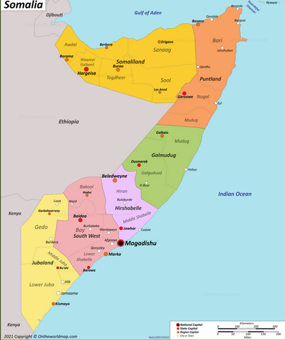 The nation of Somalia—located on the eastern horn of the African continent—went through a devastating civil war in 1991. Somalia, after 1991, was divided into tribal regions, designated as Somaliland, Puntland, Galmudug, Hirshabelle, South West, and Jubaland shown in the map below: