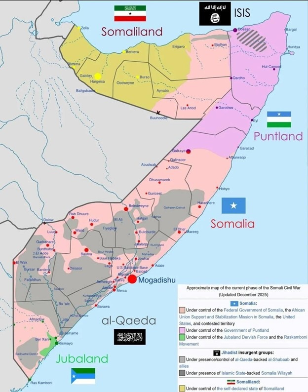 Somaliland’s declared independence led them to issue its own passport (starting in 1996), currency (introduced in 1994), central bank (established in 1994), and country calling code, even though it is not recognized as a sovereign country as of November 2025. Somalia has not been united as a country to govern since 1991 with the presence of al Qaeda, Al-Shabaab, and Islamic State Sunni Muslim terrorist groups controlling varying square miles of Somalia. The map below shows Somalia divided in December 2025.