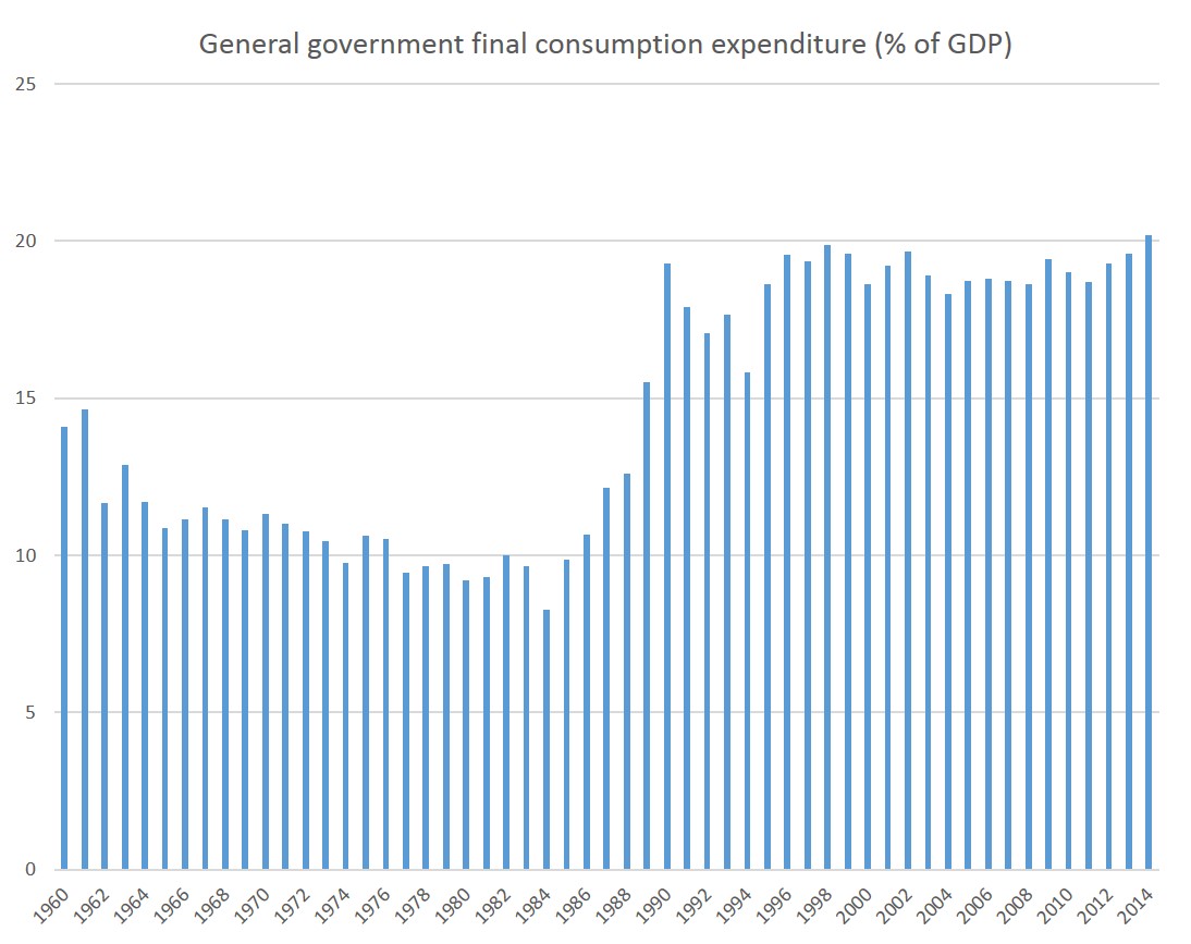 Perhaps more government spending can solve the problem? Well, probably not since government expenditure as a percentage of GDP hit a 50 year high in 2014. (It's at least a 50 year high since my data only goes back to 1960.) Government expenditure reached 20.1 percent in 2014: