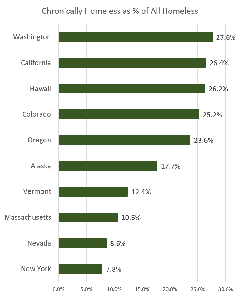 And while California is not the worst in terms of the proportion of the population that is homeless, the state is among the worst in delivering state services designed to lessen homelessness overall. Among the top-ten states with the highest percentage of homeless, California has the highest number of unsheltered homeless.1 Nearly 69 percent of the homeless population in California is estimated to be on the street. Massachusetts, by contrast, provides shelter to over 95 percent of its homeless population. Unsheltered homeless are also far less likely to receive treatment for mental illness or urgent health issues.