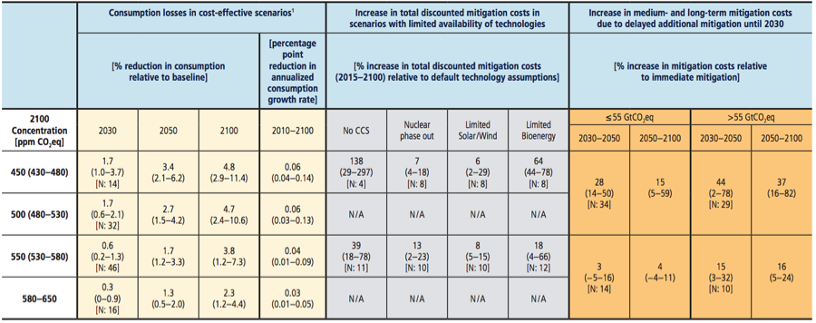 Now to be sure, the rhetorical point of the above table in the AR5 was to encourage support for climate mitigation policies. The people who put together this table for policymakers wanted to show, “Hey, since we’re obviously going to have to deal with climate change eventually, we might as well get going, because the longer we delay, the more expensive it will be.”