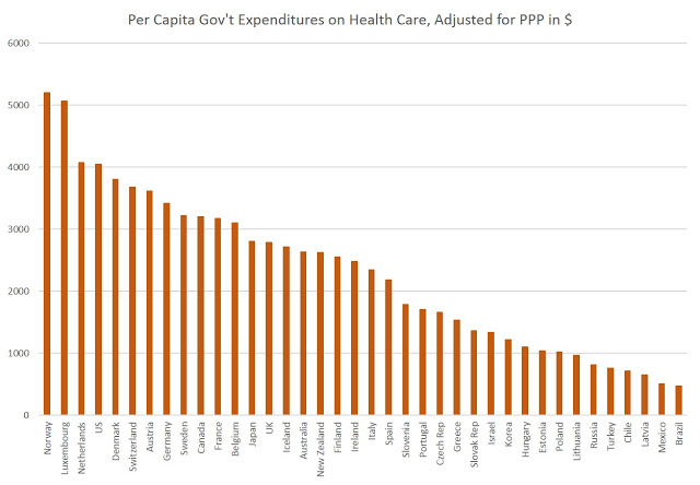 This data is from the world Health Organizations 2014 report on healthcare spending. The data pre-dates the implementation of Obamacare. Specifically, per capita government spending in the US comes in at $4,047 behind Norway ($5,198), Luxembourg (5,061), and the Netherlands ($4,070), and is also quite comparable to Denmark ($3,801).