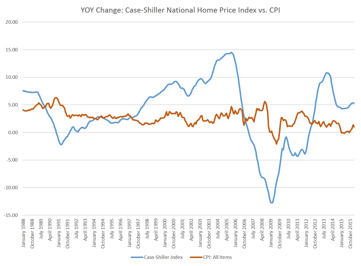 In fact, looking at home price growth according to this index, we find year-over-year growth rates in this cycle have never matched where they were in 2005 and 2006. I've also compared the C-S index growth to year-over-year growth in the CPI to get a better sense of real home price growth: