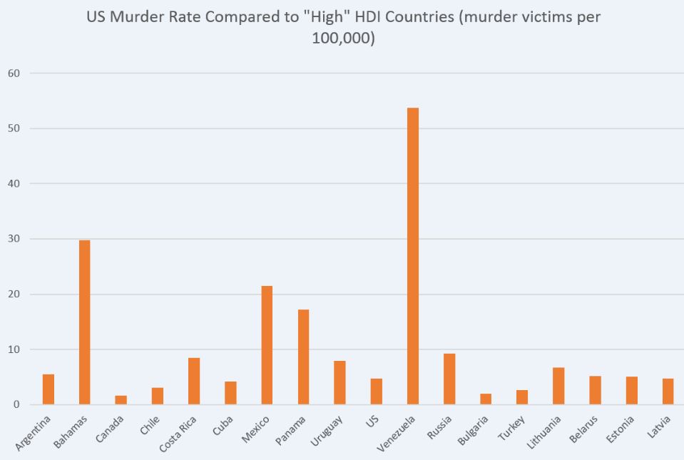 You can see where this is going. If we include countries that have HDI numbers similar to — or at least as high as — OECD members Turkey and Mexico, we find that the picture for the United States murder rate looks very different (correctly using murder rates and not gun-deaths rates):
