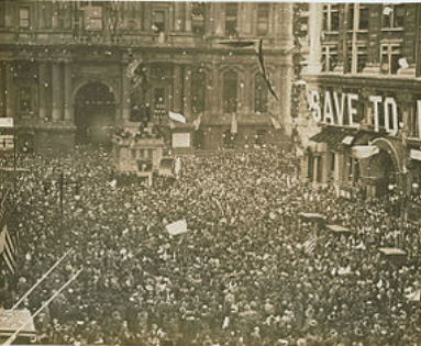 In memoirs, diary entries, and letters, we find that for the fighters of the First World War, the Great thing about the War was its end. In victorious countries, schools let out, impromptu parades and rallies erupted. These outbursts recognized victory, to be sure, but they chiefly celebrated the end of the war. My own grandmother recounted to me, more than once and each time luminously, the ecstatic celebration in her little town of Murray, Kentucky, where school was cancelled and virtually everyone in town gathered in the courthouse square to celebrate. In my recollection, she never mentioned the word "victory" once. In Rickenbacker's squadron, everyone from pilot to cook joined in a mad celebration, but not of victory, "many of them shouting 'I survived the war! I survived the war!"
