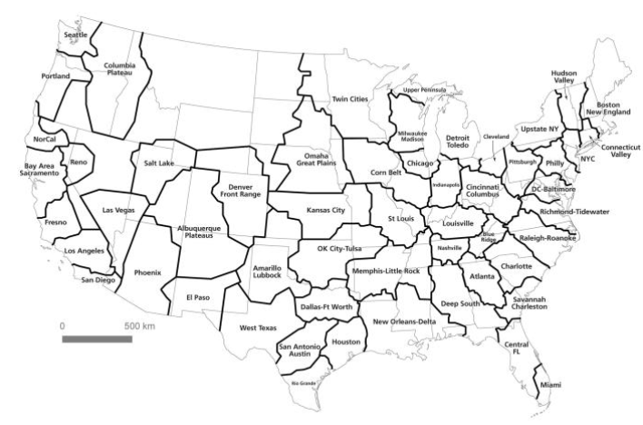 Basing their standard of scale on tolerance for commute times, the geographers selected 50-mile commutes as an indicator of how closely tied together is a specific region. The end result was this: