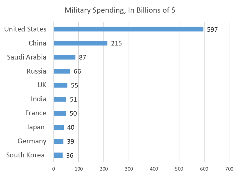 Moreover, most of the other top-ten countries in terms of military spending are US allies such as the UK, France, India, and South Korea.