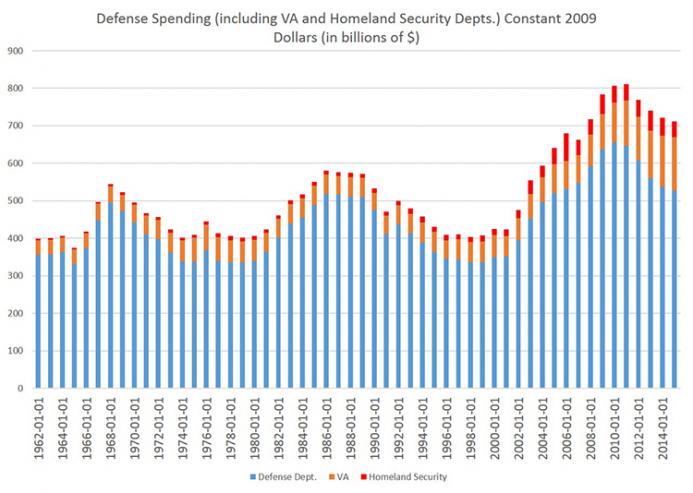Total defense spending is estimated to be $711 billion in 2015, compared to $721 billion in 2014. That’s a decline of 1.2 percent, year-over-year. But total spending remains up 68 percent over 2001 levels, and up 22 percent over the Cold War peak year in 1986. During the eight years of George W. Bush’s presidency (2001 through 2008), the federal government spent $4.7 trillion on defense. During the seven years of the Obama years, from 2009 through 2015, the federal government spent $5.3 trillion.