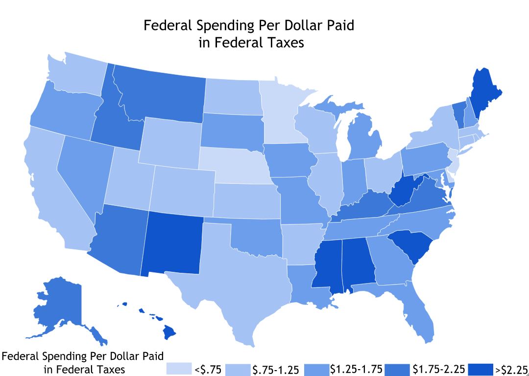Nationwide, the tax-spending ratio is not one dollar, but it about $1.20. So, states that are getting around $1.20 back for every dollar extracted in taxes are really just at the national average.